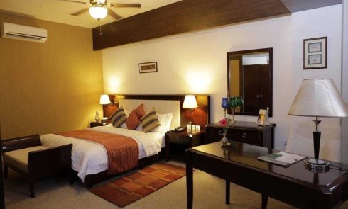 Standard Room is available with elegant dark wood furnishings. It’s a one-bedroom accommodation with a private bathroom and a cozy seating area with large windows.